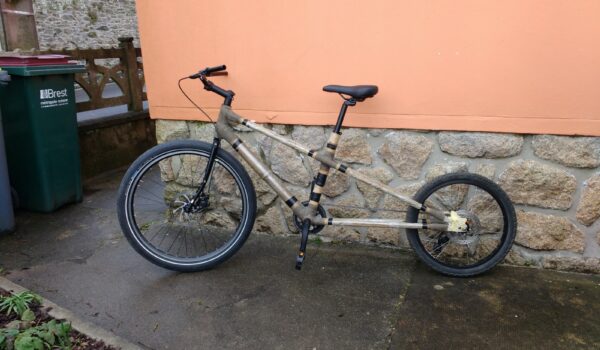 Au bout du compte, un vélo au design fonctionnel qui circule depuis 1 an pour animer des ateliers de maintenance cycle. Depuis septembre, il est équipé d’un moteur dans la roue avant qui permet à ma compagne de s’en servir pour déposer son fils à l’école.
