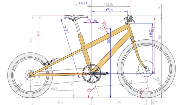 Le second prototype a donc commencé avec la conception des pattes et leur découpe par Toliroise à Brest. La géométrie choisie est légèrement plus longue que celle du premier vélo, l’empattement total passe de 1,3m à 1,43m. L’objectif est d’avoir un peu plus de place pour les 2 sièges enfants.