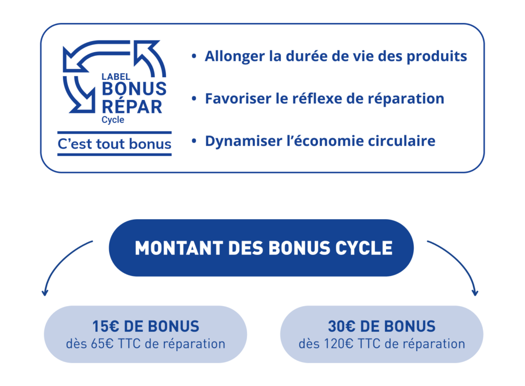 Le bonus sert à financer la réparation des éléments indispensables au bon fonctionnement du vélo. Voici la phrase qui définit officiellement ce qui est pris en charge : Toutes les actions permettant de remettre en état un vélo afin d’en maintenir l’usage en toute sécurité et ainsi allonger sa durée de vie.
